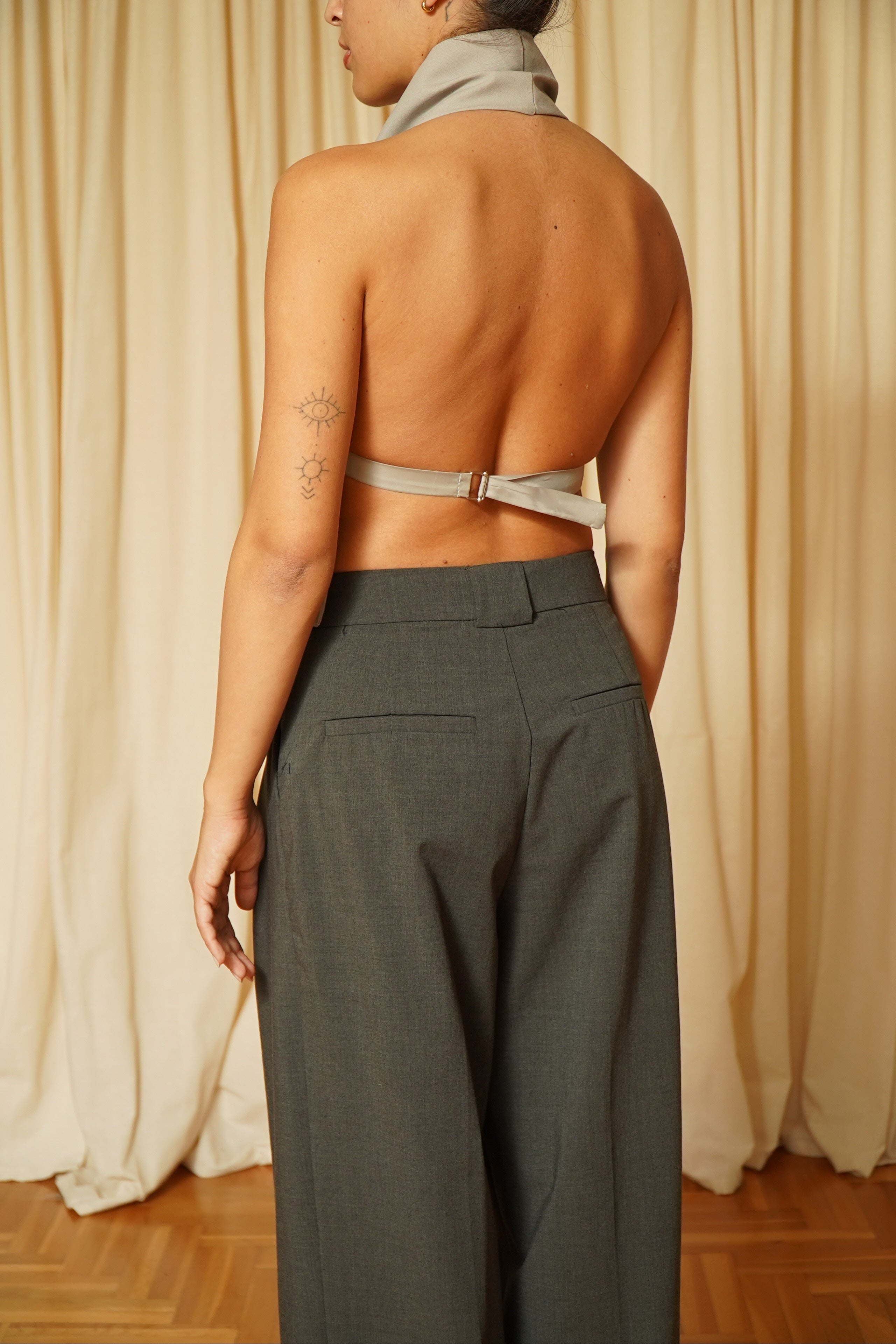 Estas prenda ha sido seleccionada cuidadosamente y rediseñadas en nuestro pequeño taller de Pamplona por Legar y Mari Jose para prolongar su vida útil. La tira trasera permite regular la anchura.